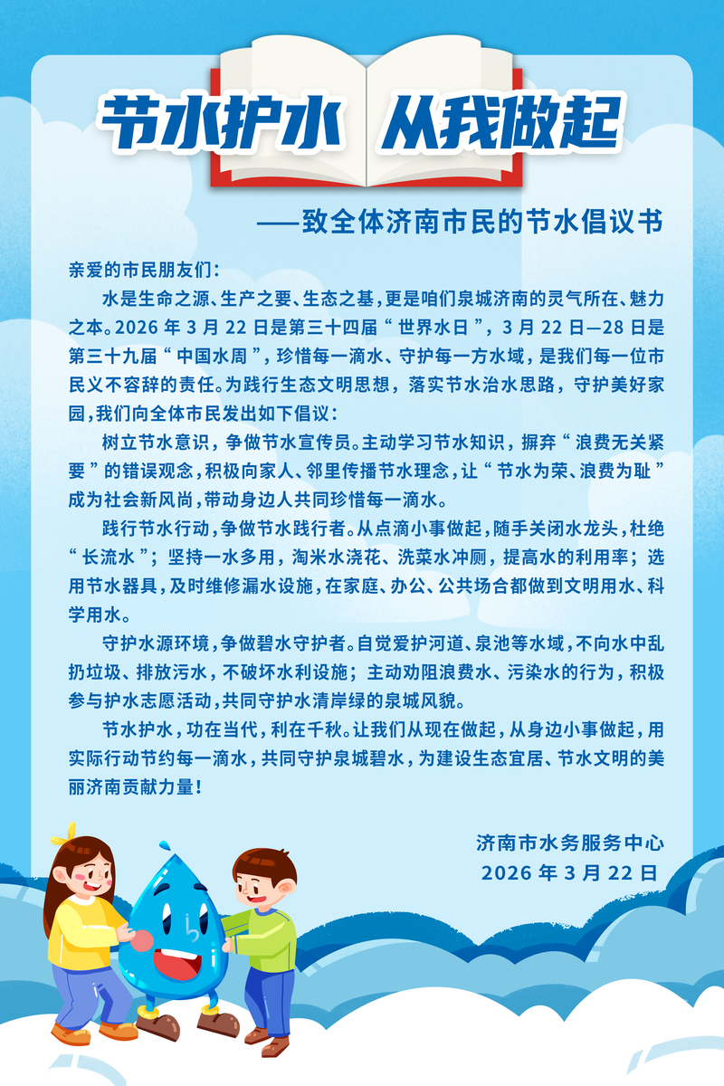 线上线下齐发力,拓宽宣传覆盖维度。线上依托“济南市水务服务中心”微信公众号,发布“节水护水 从我做起”倡议书,面向全体市民发出节水号召,让节水理念传遍千家万户;线下整合商场、政务场所、写字楼等公共资源,利用电子大屏循环播放节水宣传视频与口号,让市民随时随地感受节水氛围,实现宣传可视化、常态化,全面扩大活动影响力。